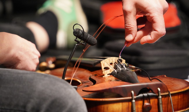 Violin, viola, cello, electric guitar, and motors.